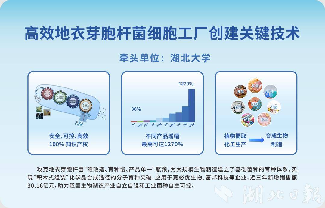 湖北省“61020”全链条攻关成果年度评选,旨在聚焦重大基础研究、关键技术突破与标志性产品创新。此次湖北大学技术入选,标志着该校在生物制造领域建立基础菌种育种体系,为我国生物制造产业自立自强和工业菌种自主可控奠定重要基础。