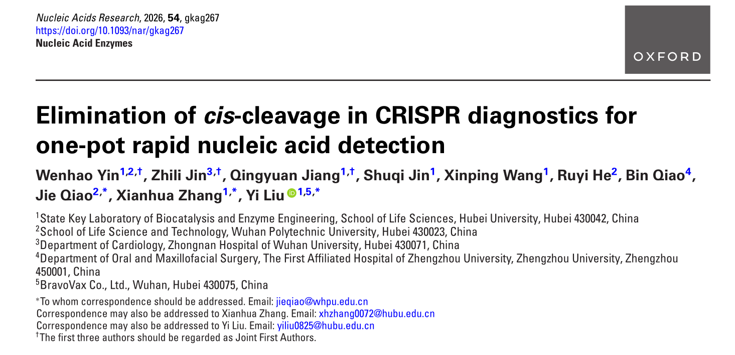 近日,湖北大学刘奕教授课题组最新研究成果“Elimination of cis-cleavage in CRISPR diagnostics for one-pot rapid nucleic acid detection”发表于国际著名期刊《Nucleic Acids Research》杂志(最新中科院分区1区Top,影响因子13.3)。湖北大学2025级博士生殷文浩,2023级硕士生蒋清源为本文的共同第一作者,张献华副教授为共同通讯作者,刘奕教授为最后通讯作者,湖北大学为第一作者单位。