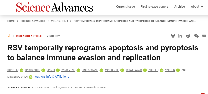 近日,湖北大学生命科学学院病毒学和疫苗研究中心陈明周教授团队继续在呼吸道合胞病毒(RSV)的机制研究中取得新的突破,在Science子刊《Science Advances》上发表了题为“RSV Temporally Reprograms Apoptosis and Pyroptosis to Balance Immune Evasion and Replication”的研究论文。该研究系统阐明了呼吸道合胞病毒(RSV)在感染不同阶段对细胞凋亡与细胞焦亡时空动态调控机制,揭示了程序性细胞死亡过程的时序性调控在呼吸道合胞病毒复制、传播及宿主炎症反应中的关键作用。